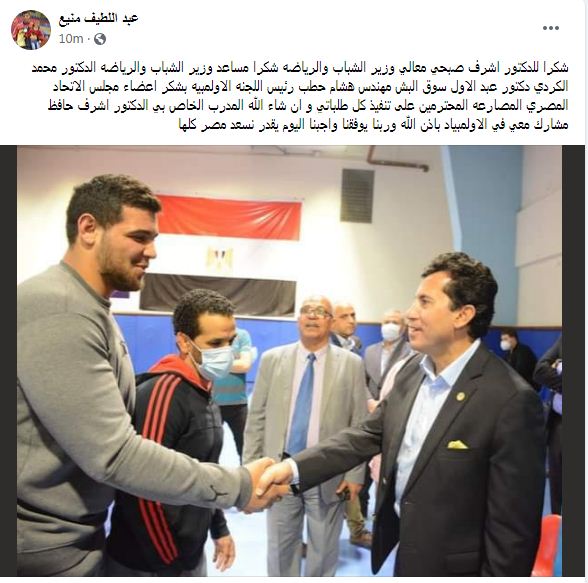 وجه عبد اللطيف منيع، لاعب منتخب المصارعة، رسالة شكر إلى الدكتور أشرف صبحي، وزير الشباب والرياضة، بعد الاستجابة لطلبه باصطحاب مدربه معه خلال أولمبياد طوكيو 2020.