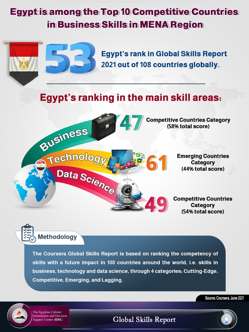 رصد مركز المعلومات ودعم اتخاذ القرار تحسن وضع مصر في تقرير المهارات العالمي الصادر عن مؤسسة كورسيرا في يونيو 2021؛ إذ جاءت فيه مصر ضمن أفضل 10 دول تنافسية في الشرق الأوسط وشمال إفريقيا وفي الترتيب الـ47 من بين 108 دول عالميًّا في مجال مهارات الأعمال.