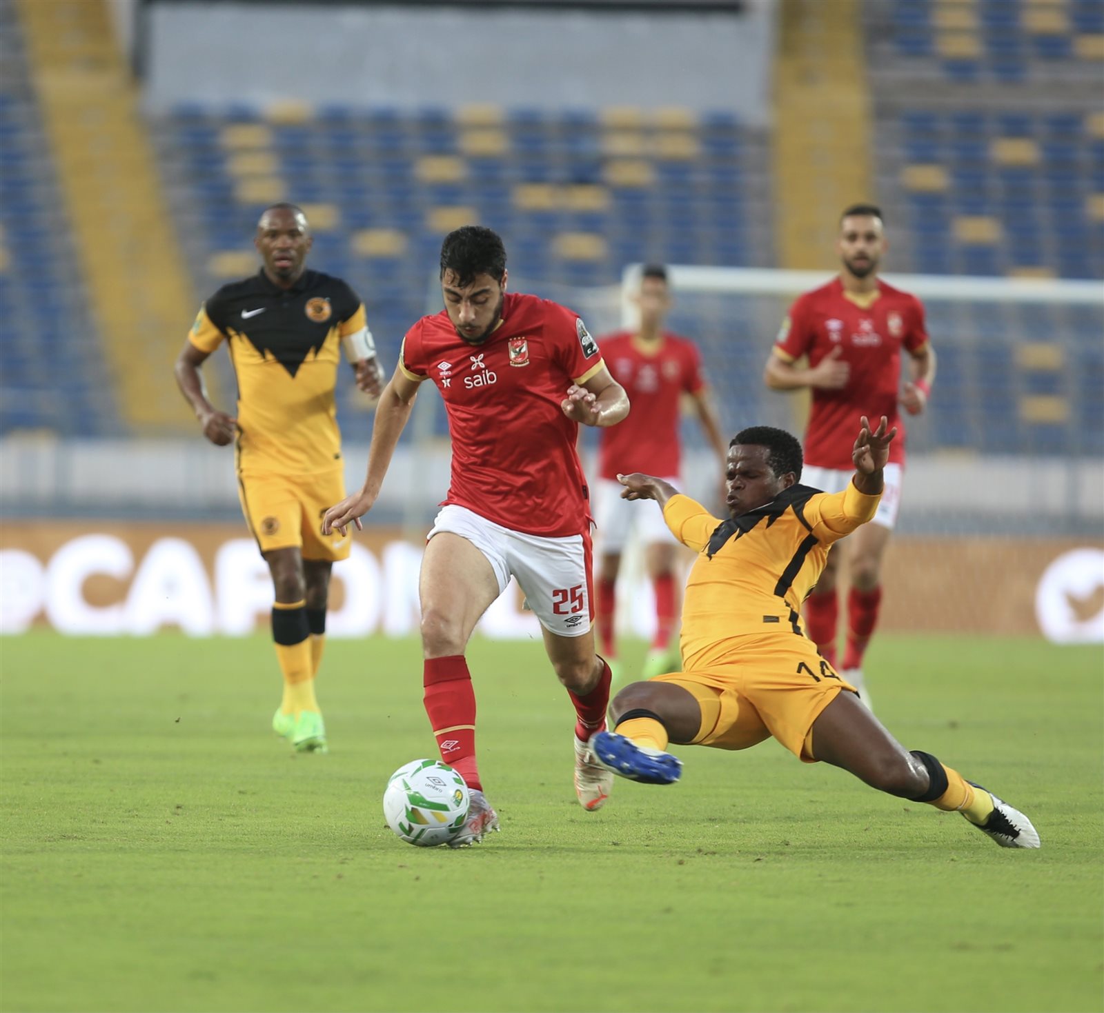 وفي الدقيقة 21، حصل أيمن أشرف لاعب الأهلي، على بطاقة صفراء، بعد تدخل قوي على لاعب كايزر تشيفز.