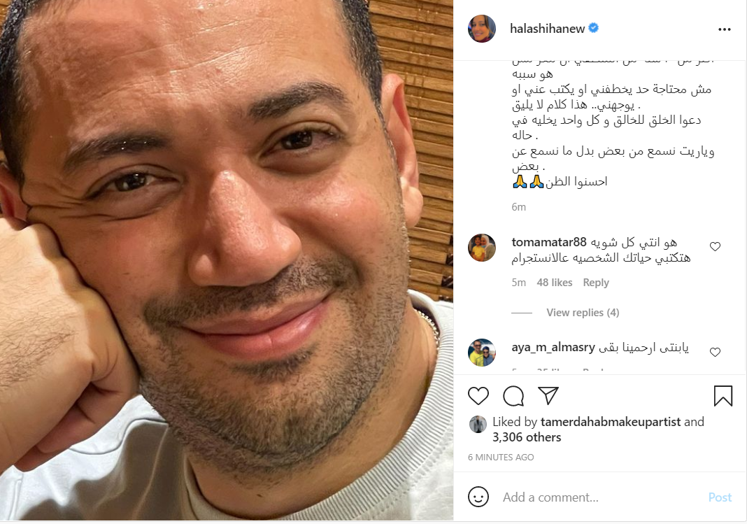 وكتبت حلا شيحة، منشورًا عبر حسابها الشخصي بموقع “انستجرام”، قائلة: “الحقيقة مصدومة من الكلام اللي والدي قاله عن زوجي اللي اتجوزته بكامل إرادتي، والحمد لله لقيت معه كل المعاني الجميلة من احترام ورجولة وشهامة نادرة الأيام دي.. وأنا لم يخطفني أحد، كما قال والدي، والكلام ده لا يصح أبدًا..أنا بحب زوجي وسعيدة بحبه ليا وبنحترم بعض، ومعز بيحترم رأيي وبيقدر مشاعري وبالعكس هو دائما بيهدّيني".