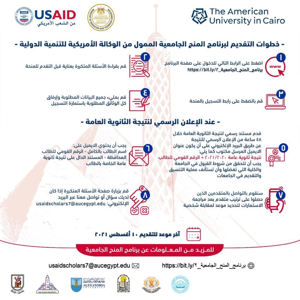 أعلنت وزارة التربية والتعليم، فتح التقديم في برنامج المنح الجامعية المُقدم من الوكالة الأمريكية للتنمية الدولية بالتعاون مع الجامعة الأمريكية بالقاهرة من الآن وحتى 10 أغسطس 2021.