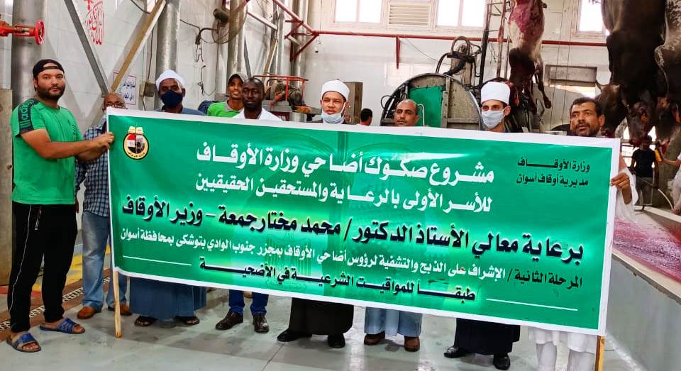 وأعلنت وزارة الأوقاف بحضور الدكتور رمضان عبد السميع مدير مديرية أوقاف أسوان، وبحضور وفد من أئمة وقيادات الدعوة بالمديرية عملية الذبح الشرعي لأضاحي الأوقاف، تحت إشراف الأطباء البيطريين.