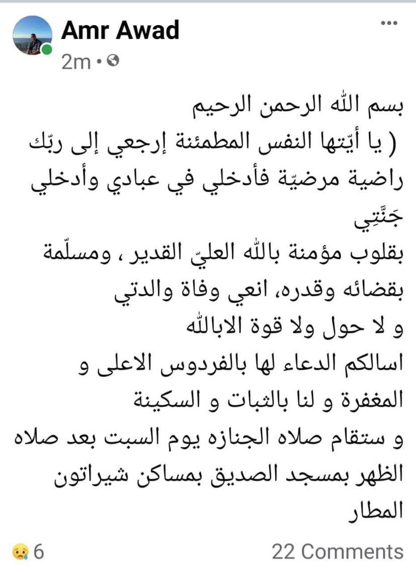 وأضاف عوض: “بقلوب مؤمنة بالله العلى القدير، ومسلمة بقضائه وقدره أنعى وفاة والدتي ولا حول ولا قوة إلا بالله.. أسألكم الدعاء لها بالفردوس الأعلى والمغفرة ولنا بالثبات والسكينة”.