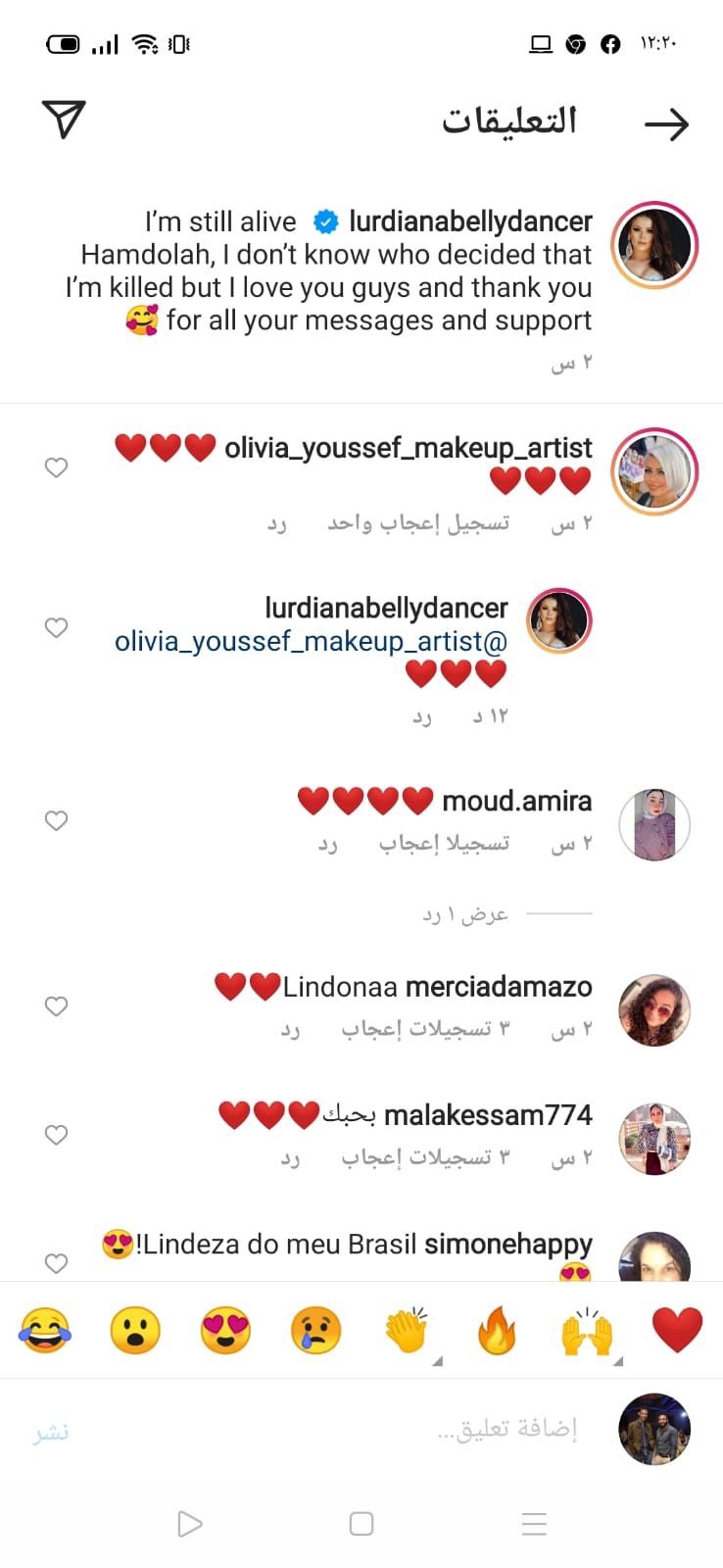 ونشرت "لورديانا" فيديو لها وهي ترقص عبر حسابها بموقع الصور الشهير "إنستجرام" وصاحبته بتعليق: “أنا عايشة ومعرفش مين قرر أني اتقتلت!”.