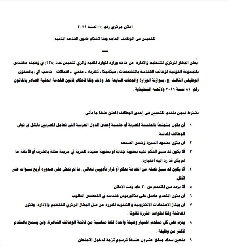 أعلن الجهاز المركزي للتنظيم والإدارة عبر بوابة الوظائف الحكومية، 238 تعيينًا حكوميًا، لشغل وظيفة مهندس، بوزارة الموارد المائية والري.