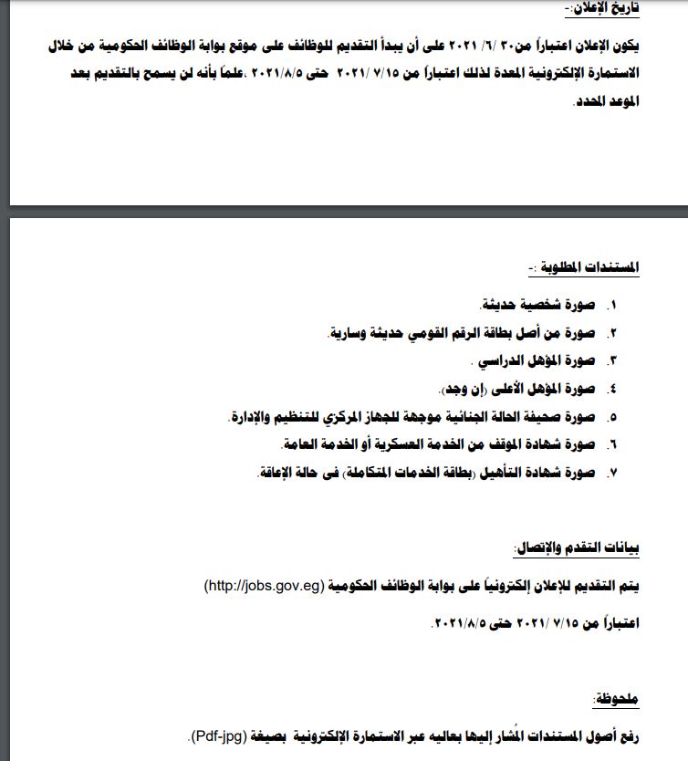 وأشار الجهاز إلى أن التخصصات المطلوبة شملت (ميكانيكا - كهرباء - مدني - اتصالات - حاسب آلي)، وذلك بالمستوى الوظيفي الثالث (ج) بموازنة الوزارة والجهات التابعة لها، وفقا لأحكام قانون الخدمة المدنية لقانون 81 لسنة 2016.
