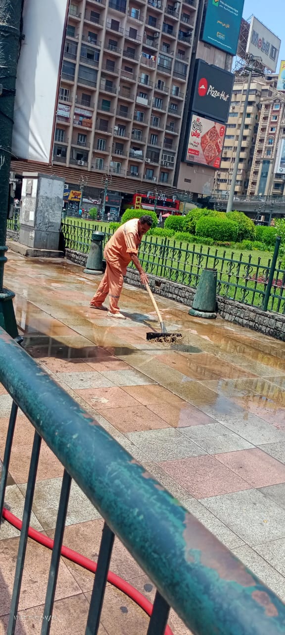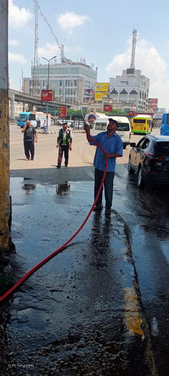 غسل عمال النظافة التابعين لهيئة نظافة وتجميل القاهرة ميدان رمسيس، وذلك ضمن حملة غسيل وتطهير لشوارع القاهرة بعد انتهاء إجازة عيد الضحى المبارك.