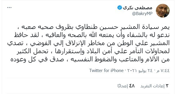 وقال بكري في تغريدة له عبر موقع التدوينات القصيرة “تويتر” إن المشير حسين طنطاوي يمر بظروف صحية صعبة.