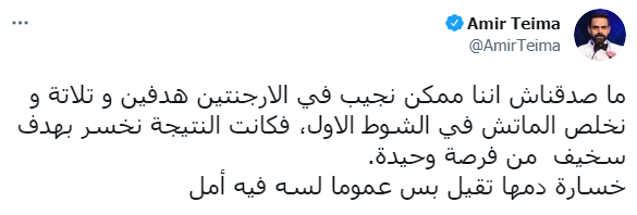 وتابع أمير طعيمة في تغريدته: “فكانت النتيجة نخسر بهدف سخيف من فرصة وحيدة.. خسارة دمها تقيل بس عموما لسه فيه أمل”.
