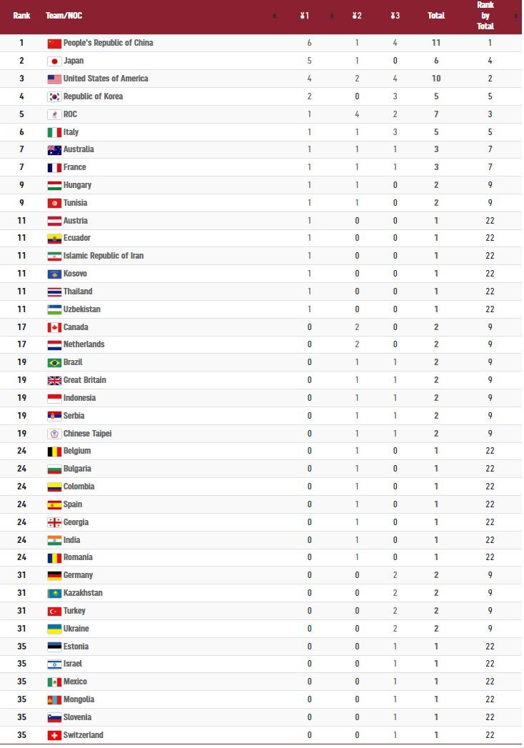 وإجمالًا رفعت الصين رصيدها من الميداليات إلى 11 ميدالية متنوعة، منها 6 ذهبيات وفضية واحدة، و4 برونزيات، متفوقة على اليابان صاحبة الـ5 ذهبيات، وفضية واحدة.