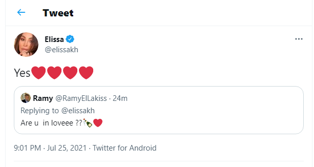 وقالت إليسا على حسابها الشخصي بـ "توتير": “نعم"، ردًّا على أحد المتابعين الذي سألها قائلًا: “هل تعيشين قصة حب؟".