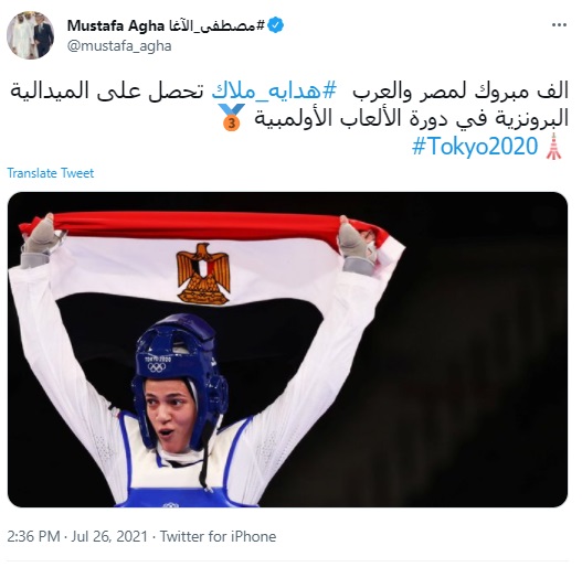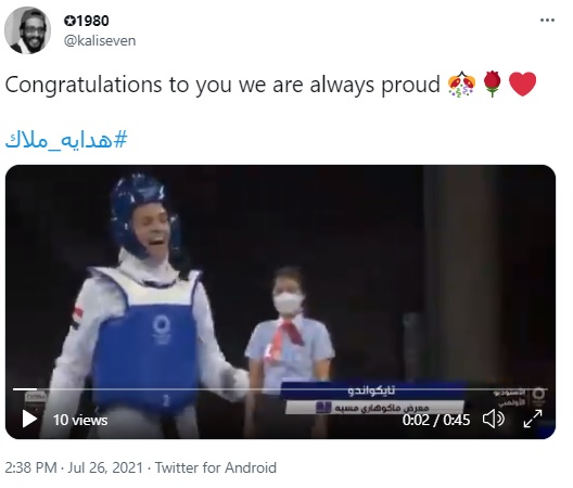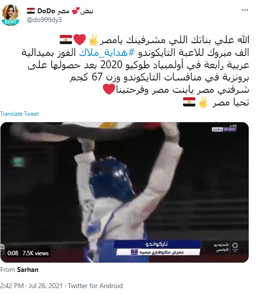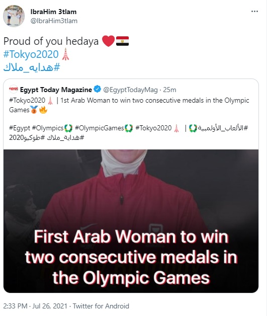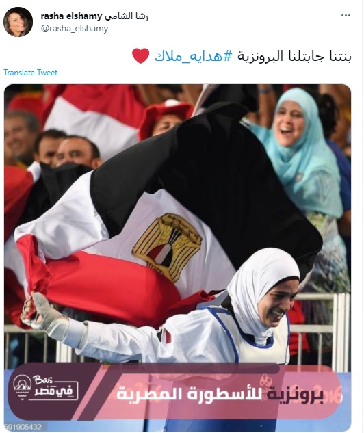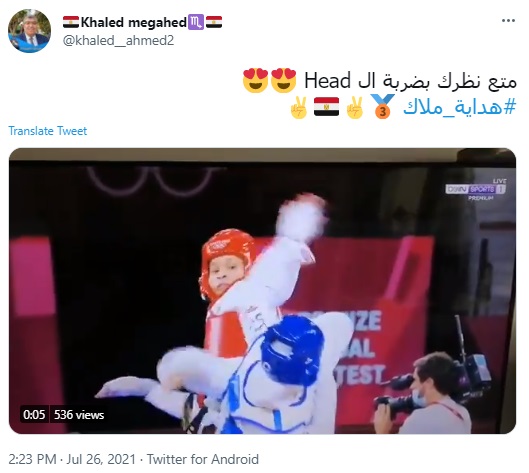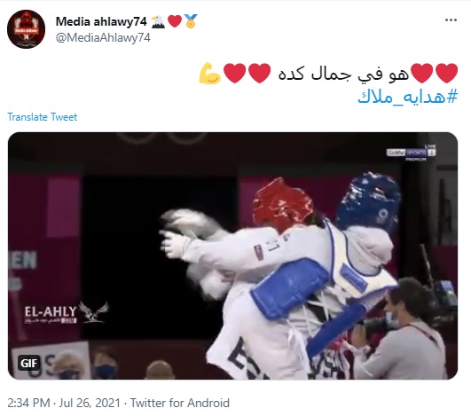 بينما علق خالد مجاهد، قائلًا: "متع نظرك بضربة الرأس"، وعلق حساب آخر: "الله علي بناتك اللي مشرفينك يامصر،الف مبروك للاعبة التايكوندو هداية ملاك الفوز بميدالية عربية رابعة في أولمبياد طوكيو 2020 بعد حصولها على برونزية في منافسات التايكوندو وزن 67 كجم، شرفتي مصر يا بنت مصر وفرحتينا.. تحيا مصر".