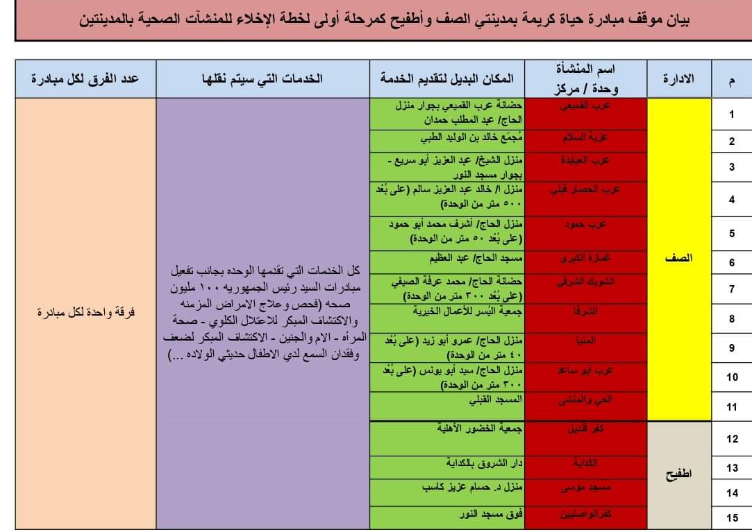 نوهت محافظة الجيزة بأنه سيتم إخلاء منشآت ووحدات صحية بمركزي الصف وأطفيح ونقلها إلى أماكن بديلة لتقديم خدماتها للمواطنين للتسهيل عليهم، وذلك نظرًا لإجراء أعمال تطوير وإحلال وتجديد شامل لتلك الوحدات والمنشآت الصحية، انطلاقًا من المبادرة الرئاسية "حياة كريمة" لتطوير جميع الخدمات المقدمة للمواطنين بقرى الريف المصري.