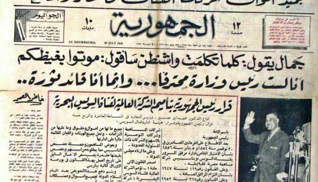 الأخبار بدورها تناولت الحدث ولم تغب عنه، حيث جاء في صدر صفحتها الأولى عنوان: “جمال عبد الناصر يعلن: تأميم شركة القناة”.