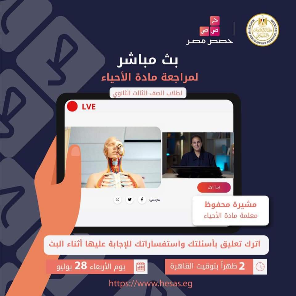 تقدم وزارة التربية والتعليم والتعليم الفني، بثا مباشرا لجميع طلاب الصف الثالث الثانوي، لمراجعة مادة الأحياء، غدًا الأربعاء، في تمام الساعة 2 ظهرًا، عبر منصة “حصص مصر” التعليمية.