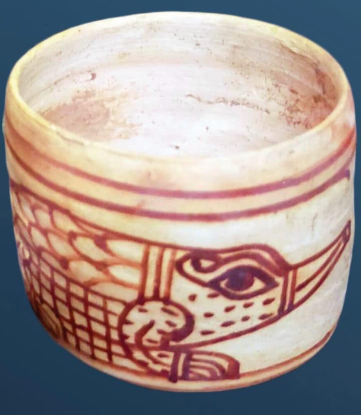 يعرض إناء من الفخار، مزين بشكل تمساح مخصص للشرب ذو حافة بيضاء. تم العثور عليه في منطقة كارنوج بالنوبة، ويرجع إلى القرنيين الثاني والثالث الميلاديين (العصر المروى). وهو مزخرف بزخارف باللون البني.