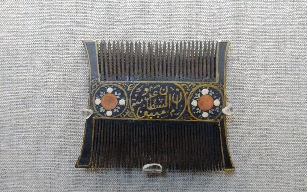 يعرض مشط من الخشب أسود اللون من العصر العثماني، كتب على أحد وجهيه جملة "ان الشيطان عدو مبين" وزخارف نباتية وهندسية ملونة.