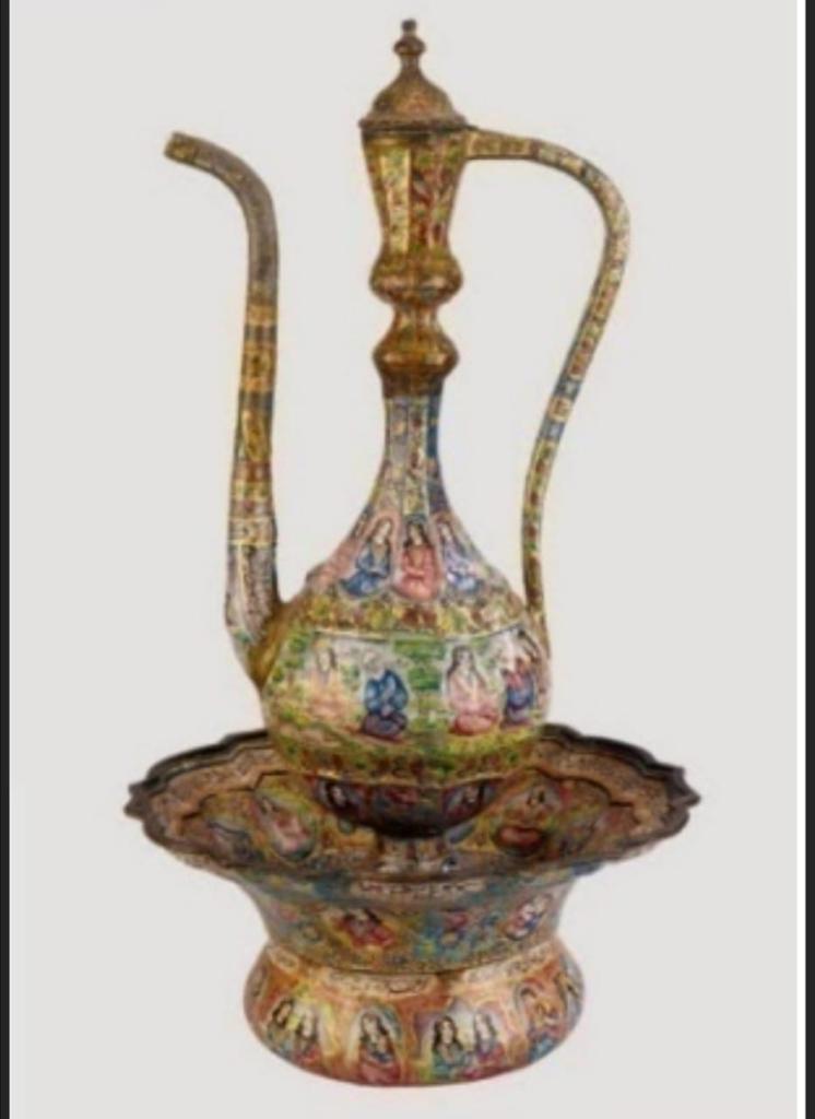 يعرض المتحف إبريق وطست من النحاس مزخرف بموضوعات تصويرية متعددة مأخوذة من قصص الأدب الفارسي ورسوم نباتية متعددة.