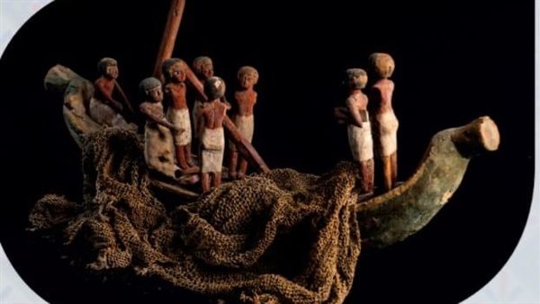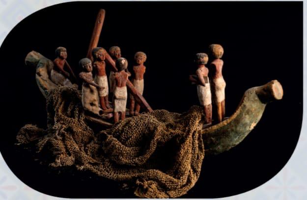 يعرض نموذج لمركب ملونة من الخشب عليها مجموعة من البحارة والصيادين والنموذج يصور عملية الصيد بالشباك.