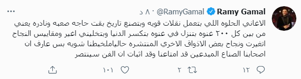 وكتب الفنان تغريدة، عبر حسابه الشخصي بموقع التدوينات القصيرة "تويتر"، مغردًا: "الأغاني الحلوة اللي بتعمل نقلات قوية، وبتصنع تاريخ بقت حاجة صعبة ونادرة، يعني من بين كل 200 غنوة بتنزل في غنوه بتكسر الدنيا، وبتخليني أغير ومقاييس النجاح اتغيرت".