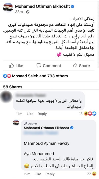 ورد “الخشت” على عدد من مستخدمي وسائل التواصل الاجتماعي، الذين حاولوا التكهن بالمجموعة التي تم التعاقد معها، بتعليق على منشوره الخاص بالقرار رصده “القاهرة 24”، قائلًا فيه:-