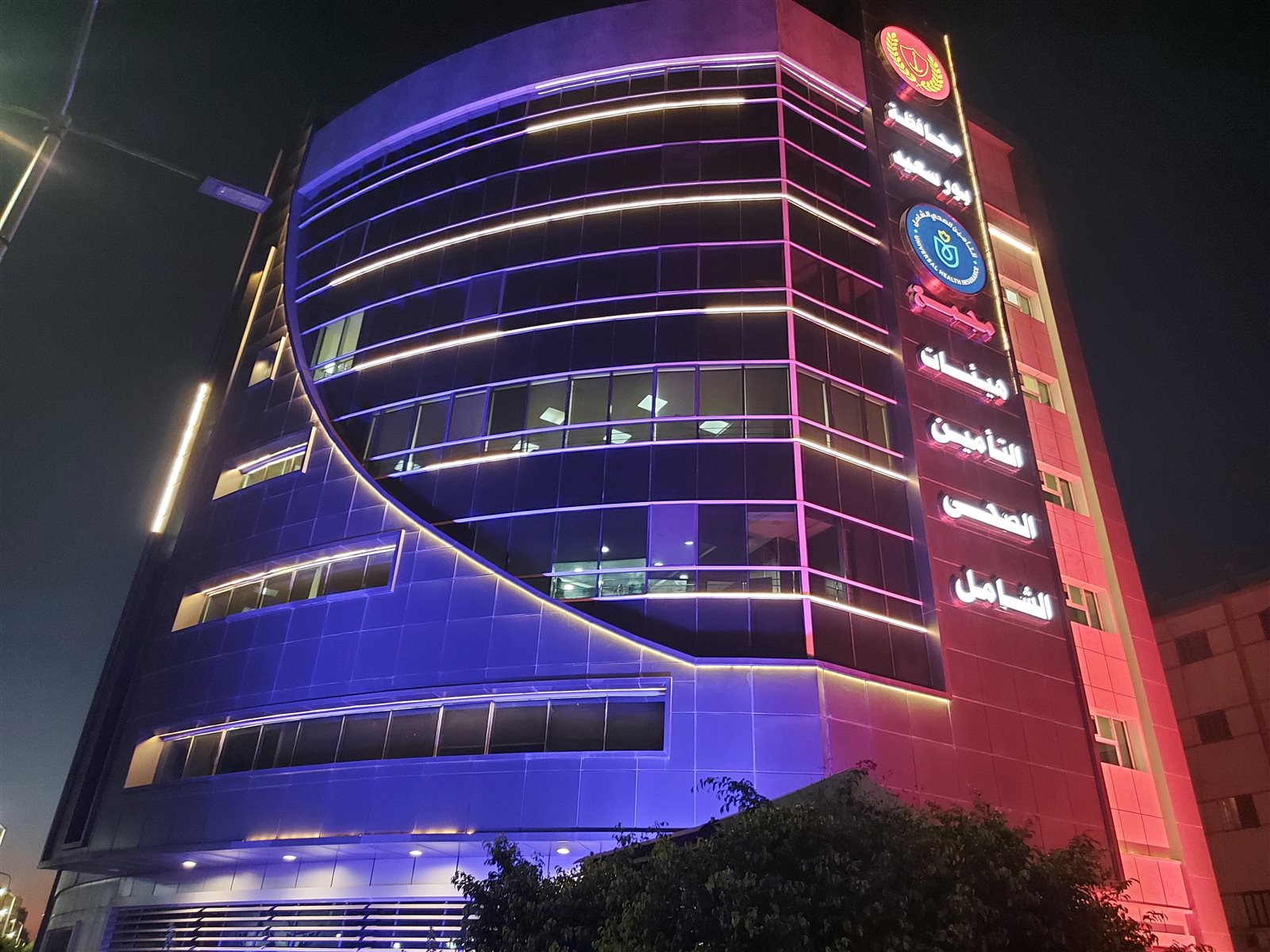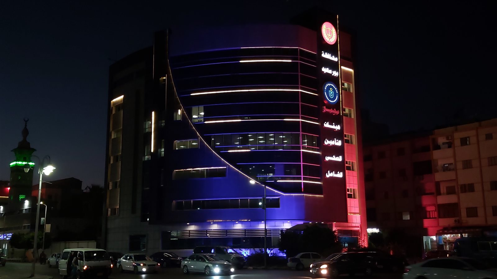 إضاءة مبنى التأمين الصحي الشامل ببورسعيد باللون الأزرق في اليوم العالمي لالتهاب الكبد (فيديو)