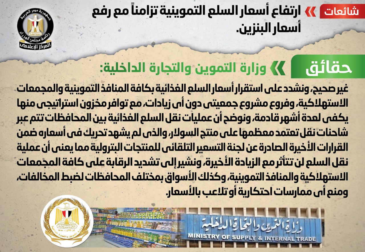 وتواصل المركز الإعلامي لمجلس الوزراء، مع وزارة التموين والتجارة الداخلية، والتي نفت تلك الأنباء، مُؤكدةً أنه لا صحة لارتفاع أسعار السلع التموينية تزامنًا مع رفع أسعار البنزين، مُشددةً على استقرار أسعار السلع الغذائية بكافة المنافذ التموينية والمجمعات الاستهلاكية، وفروع مشروع جمعيتي دون أي زيادات، مع توافر مخزون استراتيجي منها يكفي لعدة أشهر قادمة.