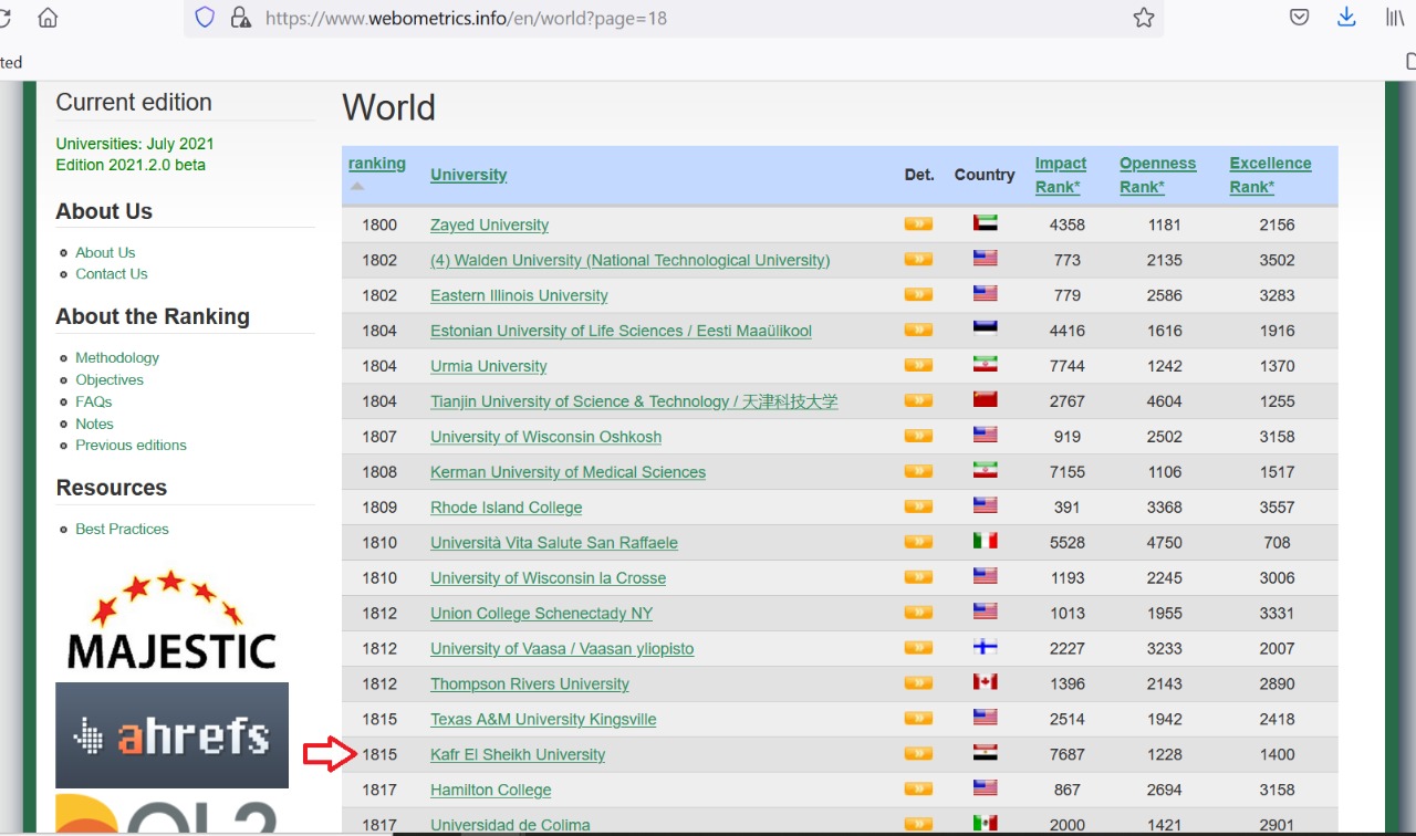 وأشار رئيس جامعة كفر الشيخ، إلى أن هذا التصنيف يستخدم كل من مؤشرات الويب والمؤشرات البيبليومترية الخاصة بالبحث العلمي، وهي مشاركة المعرفة العامة والتي تشمل حجم "عدد الصفحات" في نطاق domain الويب الرئيسي وجميع النطاقات الفرعية للجامعة، والمؤشر الثاني للتأثير ويشمل محتويات الصفحة لعدد الشبكات الخارجية التي ترتبط بصفحات ويب الجامعة.