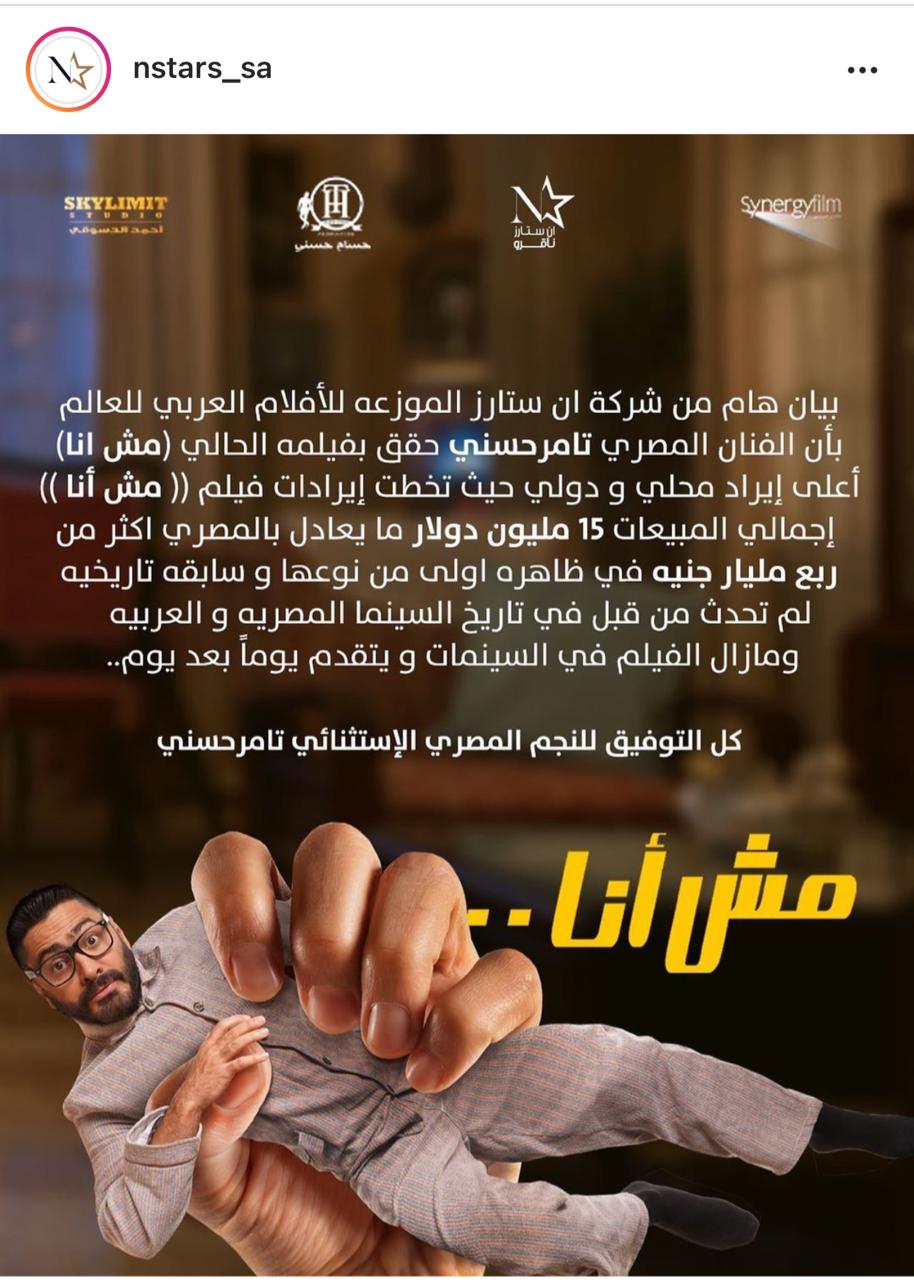وذكرت الشركة في بيانها، أن الفنان المصري تامر حسني حقق بفيلمه الحالي مش أنا أعلى إيراد محلي ودولي، حيث تخطت إيرادات فيلمه إجمالي المبيعات 15 مليون دولار ما يعادل بالمصري أكثر من ربع مليار جنيه.