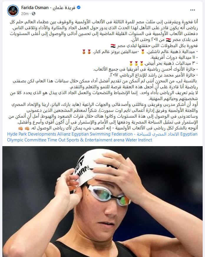 وقالت فريدة عثمان عبر صفحتها الرسمية على موقع التواصل الاجتماعي “فيس بوك”: "أنا فخورة ويشرفني إني مثلت مصر للمرة الثالثة في الألعاب الأولمبية والوقوف بين عظماء العالم، حلم كل رياضي أنه يكون قادرا على التأهل لهذا الحدث الذى يدور حول العمل الجاد والمثابرة والأداء وتلاقى الناس".