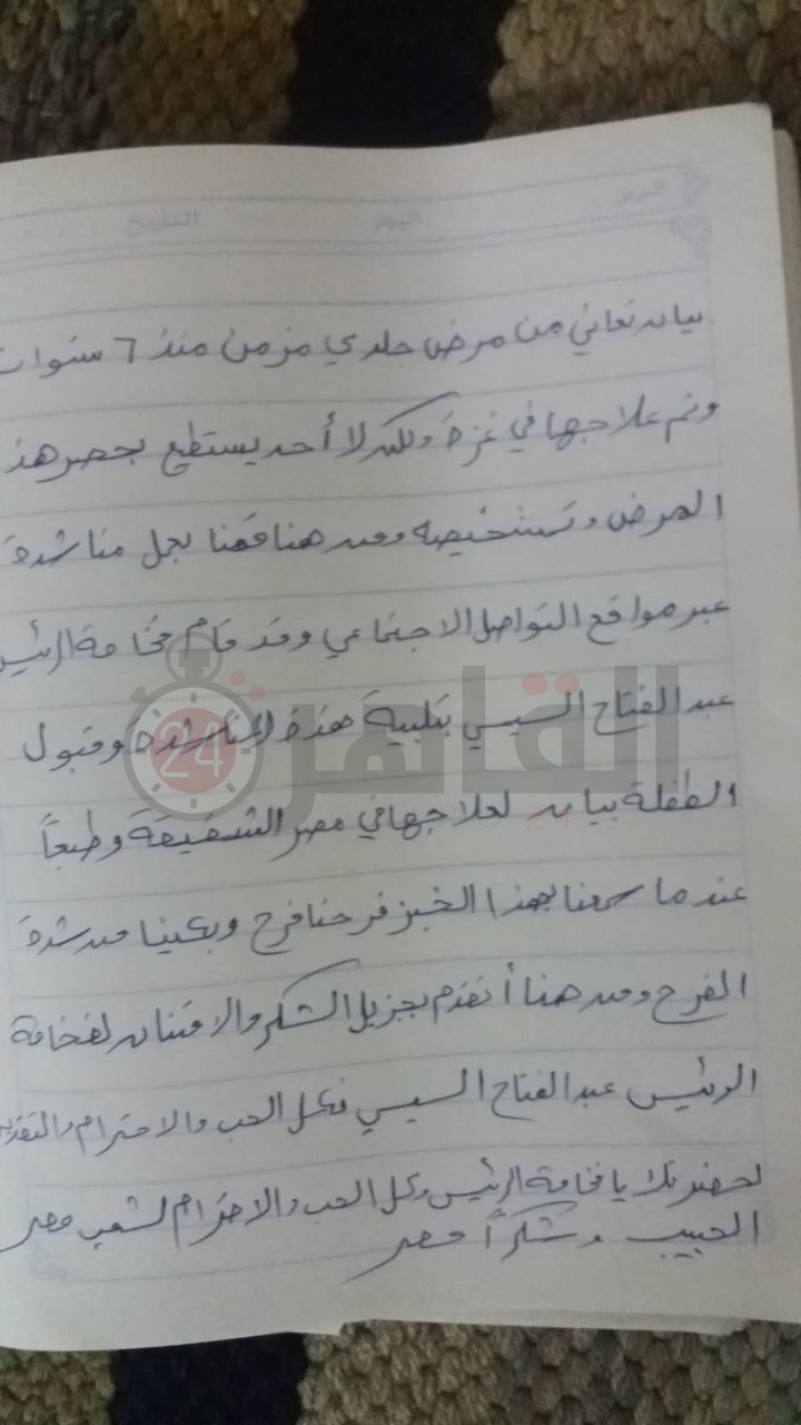 حصل "القاهرة 24" على رسالة خطية كتبها والد الطفلة الفلسطينية "بيان محمود"، يوجه فيها الشكر للرئيس عبد الفتاح السيسي بعد قرار علاجها على نفقة الدولة، وتوجهها غدًا إلى مستشفى العريش.