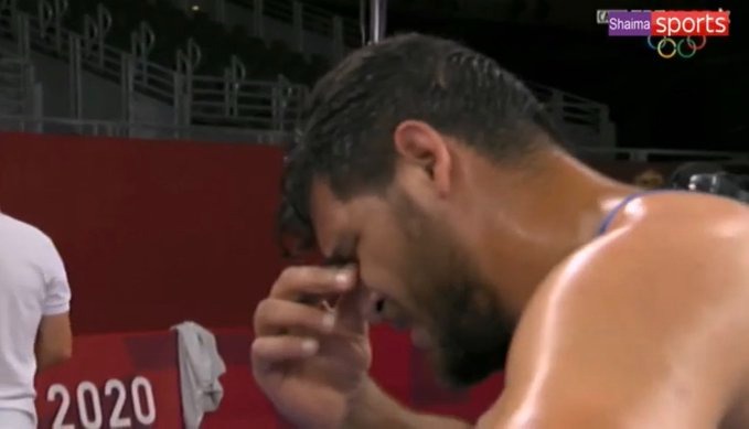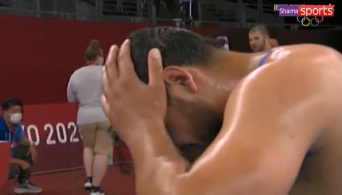 بكاء عبد اللطيف منيع عقب الخسارة على يد بطل روسيا في دور الـ16 بالمصارعة (صور)