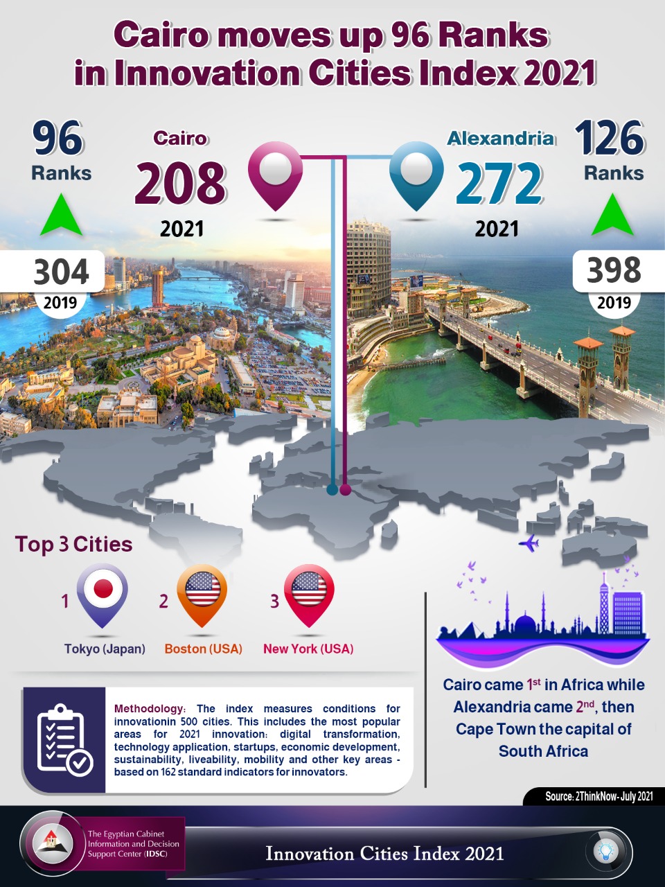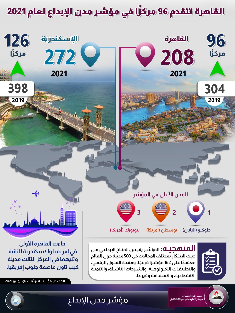 نشر مركز المعلومات ودعم اتخاذ القرار بمجلس الوزراء إنفوجرافيك بعنوان "القاهرة تتقدم 96 مركزًا في مؤشر مدن الإبداع لعام 2021"؛ حيث جاءت القاهرة في المركز 208 في مؤشر مدن الإبداع عام 2021 من بين 500 مدينة حول العالم، واحتلت الإسكندرية المركز 272 في المؤشر نفسه، في حين جاءت طوكيو عاصمة اليابان في صدارة الترتيب، يليها كلٌّ من بوسطن ونيويورك الأمريكيتين، وذلك طبقًا لمؤشر مدن الإبداع الصادر عن وكالة الابتكار توثينك ناو (2THINKNOW)، والذي أصبح أعلى مقياس لتصنيف المدن من حيث الابتكار في مختلف المجالات.