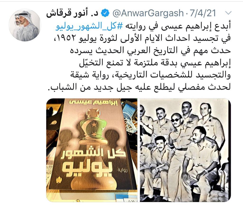 وكتب "قرقاش"، عبر حسابه على موقع التواصل الاجتماعي "تويتر"، قائلًا إنه "أبدع في تجسيد حدث مهم في التاريخ العربي الحديث يسرده إبراهيم عيسى بدقة ملتزمة لا تمنع التخيل والتجسيد للشخصيات التاريخية، رواية شيقة لحدث مفصلي ليطلع عليه جيل جديد من الشباب".