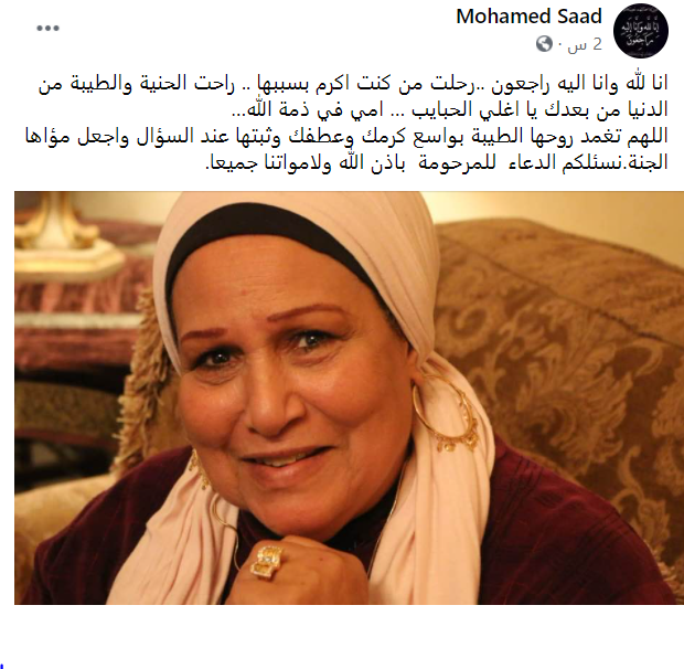 وتابع محمد سعد نجل الفنانة الراحلة فتحية طنطاوي قائلًا: “اللهم تغمد روحها الطيبة بواسع كرمك وعطفك وثبتها عند السؤال، وأجعل مؤاها الجنة.. نسئلكم الدعاء للمرحومة بإذن الله ولامواتنا جميعًا”.
