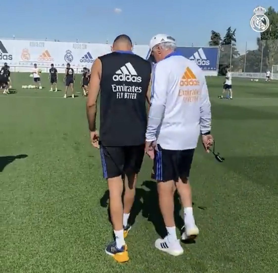 وقام بنزيما بالترحيب بزملائه، والمشاركة في المران الجماعي، بقيادة المدير الفني كارلو أنشيلوتي، مدرب نادي ريال مدريد الجديد.