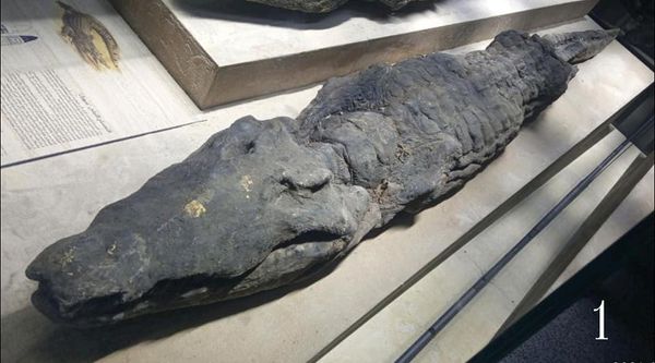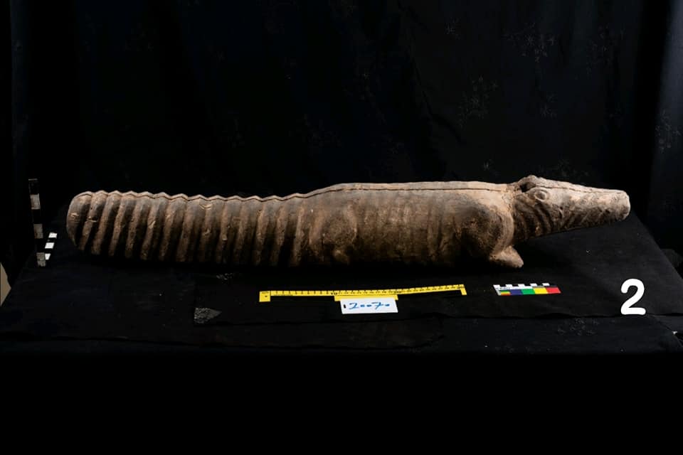 1- أحد التماسيح المحنطة والتي حفظت بعناية شديدة وغطيت وجهها بطبقة رقيقة من الذهب والتي كانت رمزًا للمعبود سوبك والذي اشتهرت عبادته في أماكن عديدة منها كوم امبو والفيوم حيث كانت تربي التماسيح في حظائر المعابد وتُطعم بالأوز المشوي والبيض والفطائر.