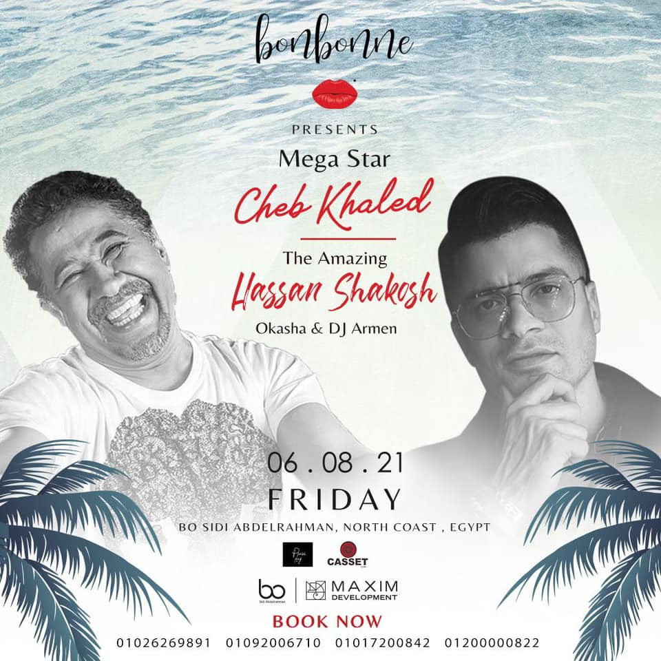 ويحيى حسن شاكوش والشاب خالد حفلهما، اليوم الجمعة 6 أغسطس، في الساحل الشمالي بقرية Bo Island، من تنظيم سيد فتوح وسيف التهامي، ومن المقرر أن يتم اتباع جميع الإجراءات الاحترازية الخاصة لمواجهة فيروس كورونا وضمان سلامة الحضور، وينتظر الجمهور سماع أغاني الشاب خالد في حفل مميز، ويعد الأول له في الساحل الشمالي.