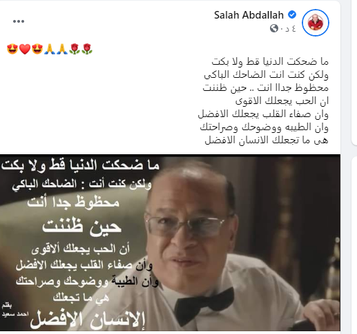 نشر الفنان صلاح عبد الله، بيت شعر عبر صفحته الرسمية بموقع التواصل الاجتماعي فيس بوك، وذلك في أول تعليق له بعد تعرضه لأزمة قلبية، أدت لدخوله المستشفى، واستدعت قسطرة في القلب وتركيب دعامة.