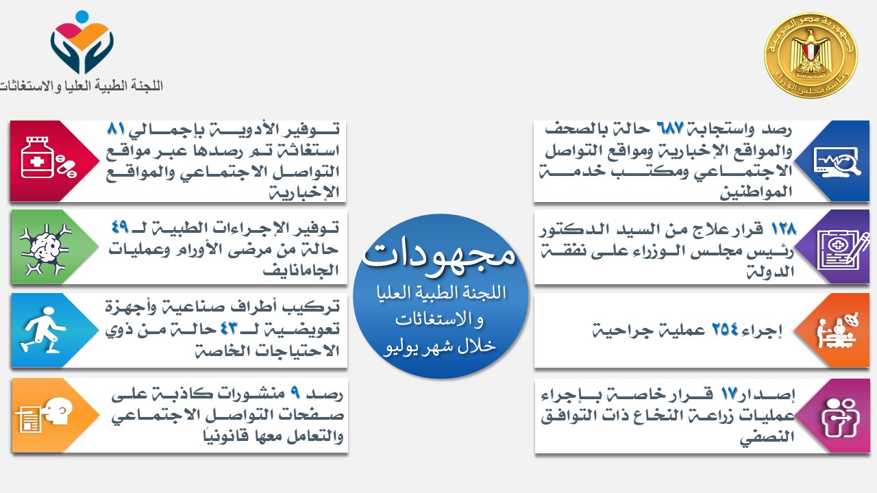 تابع الدكتور مصطفى مدبولي، رئيس مجلس الوزراء، في تقرير تلقاه من الدكتور حسام المصري، المستشار الطبي لرئاسة مجلس الوزراء، رئيس لجنة الاستغاثات الطبية، جهود اللجنة الطبية العليا ولجنة الاستغاثات الطبية بالمجلس، خلال شهر يوليو 2021، حيث أوضح أن اللجنة استجابت خلال الفترة المشار إليها لنحو 687 حالة، تم رصدها عبر الصحف والمواقع الإخبارية، ومواقع التواصل الاجتماعي، ومكتب خدمة المواطنين.