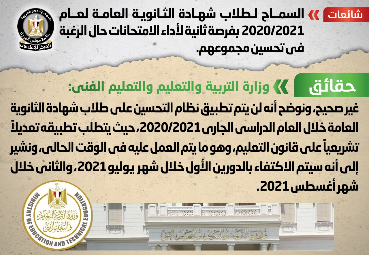 ونفت وزارة التربية والتعليم والتعليم الفني تلك الأنباء، مُؤكدةً أنه لا صحة للسماح لطلاب شهادة الثانوية العامة لعام 2020/2021 بفرصة ثانية لأداء الامتحانات حال الرغبة في تحسين مجموعهم، مُوضحةً أنه لن يتم تطبيق نظام التحسين على طلاب شهادة الثانوية العامة خلال العام الدراسي الجاري 2020/2021، حيث يتطلب تطبيقه تعديلًا تشريعيًا على قانون التعليم، وهو ما يتم العمل عليه في الوقت الحالي، مُشيرةً إلى أنه سيتم الاكتفاء بالدورين الأول خلال شهر يوليو 2021، والثاني خلال شهر أغسطس 2021.