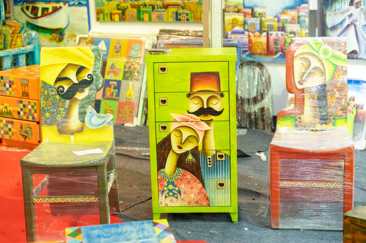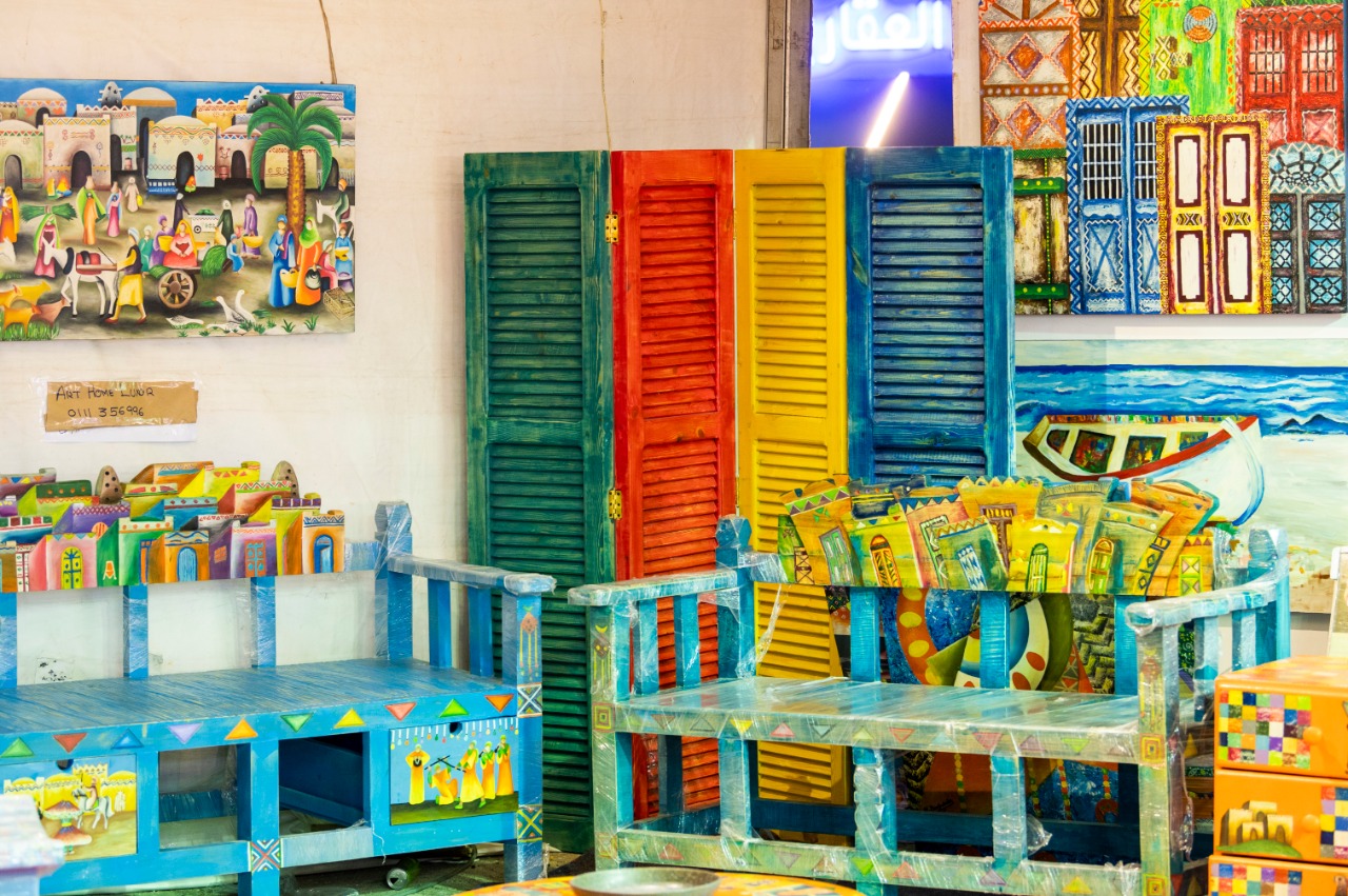 ألوان مضيئة، تسر كل من يراها من بعيد، برتقالي وأحمر وأصفر وأزرق سماوي، وعندما يقترب الزائر منها، تأخذ عينيه الشخصيات المرسومة على تابلوهات أو على مقعد أو طاولة أو محفورة على دكة كبيرة، وكأنها شخصيات كرتونية محفورة، ليكتشف أنها ثنائيات من ابتكار أتيايه آرت هوم الأقصر، الذى يتصدر معرض ديارنا بمارينا 5 بالساحل الشمالي، بجناح كبير.