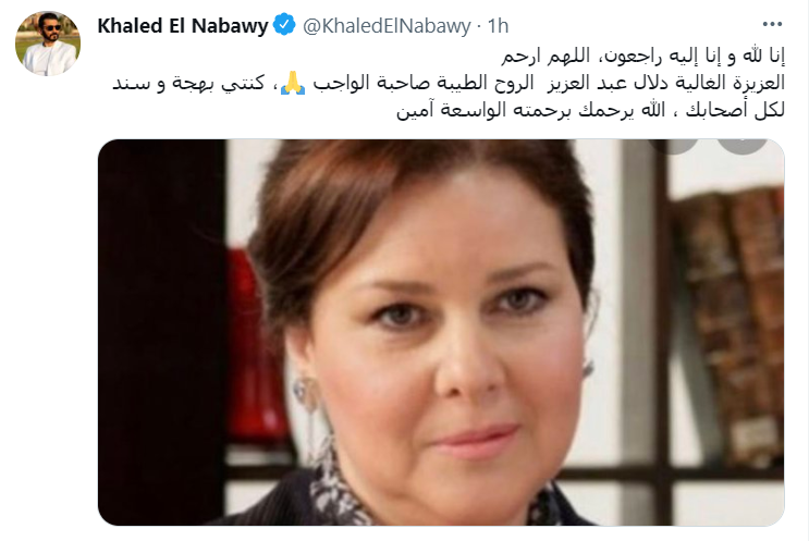ونشر خالد النبوي، صورة للراحلة عبر حسابه الشخصي عبر موقع التدوينات القصيرة تويتر، وعلق: إنا لله وإنا إليه راجعون، اللهم ارحم العزيزة الغالية دلال عبد العزيز.. الروح الطيبة صاحبة الواجب، كنتي بهجة وسند لكل أصحابك.. الله يرحمك برحمته الواسعة آمين.