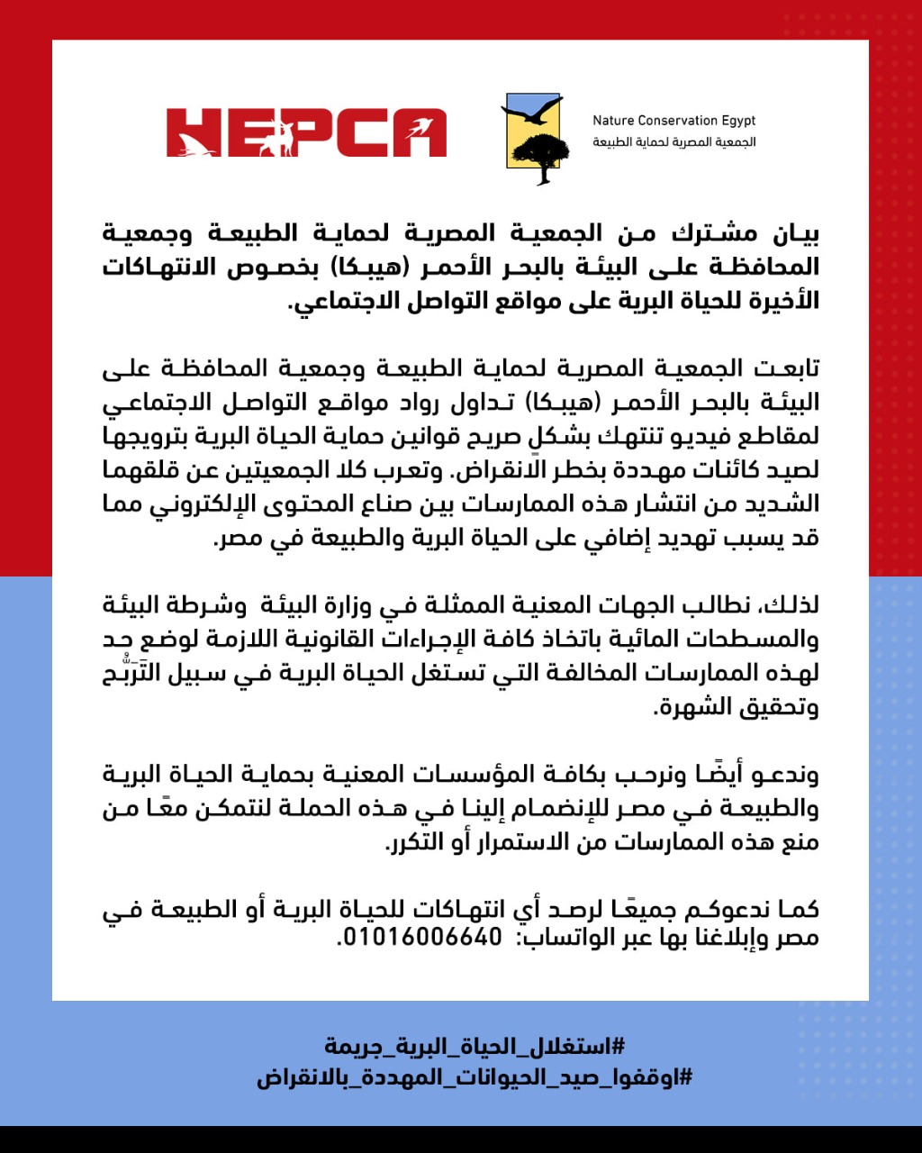 أصدرتا جمعيتا المصرية لحماية الطبيعة والمحافظة على البيئة بالبحر الأحمر (هيبكا)، بيانًا مشتركًا بخصوص الانتهاكات الأخيرة للحياة البرية لبعض الأشخاص على مواقع التواصل الاجتماعي.