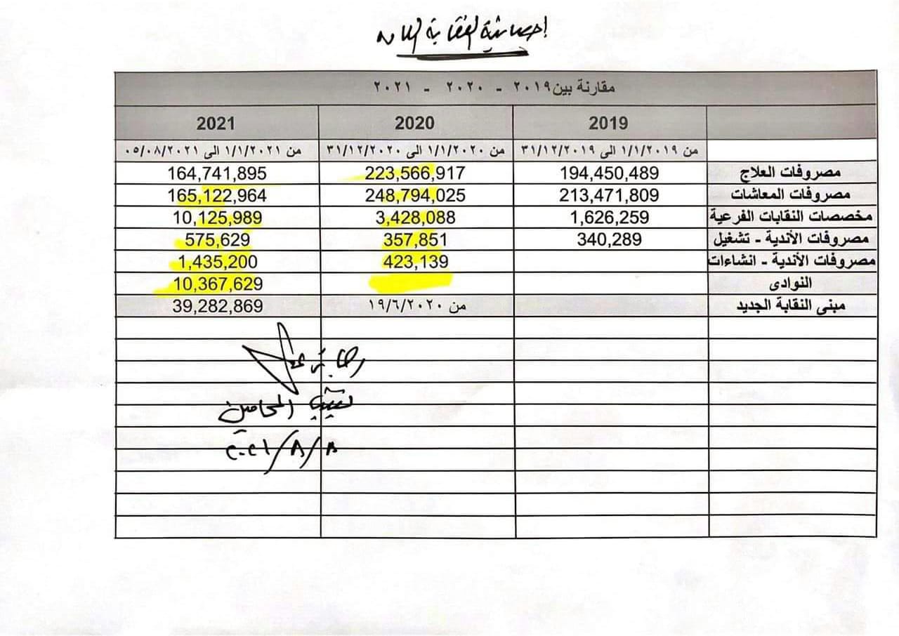 أصدرت النقابة العامة للمحامين، بيانًا بإحصائية لأوجه إيراداتها ومصروفاتها، بالمقارنة بين أعوام 2019 و2020 و2021، في أوجه مصروفات العلاج، والمعاش، ومخصصات النقابات الفرعية، ومصروفات الأندية (تشغيل ـ إنشاءات)، ومبنى النقابة الجديد.