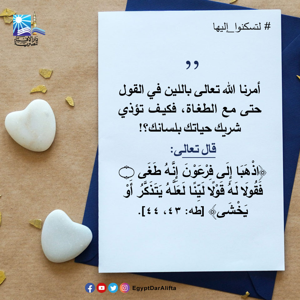 وقالت الإفتاء في منشورها، إن الله عز وجل قد أمرنا باللين في القول حتى مع الطغاة، فكيف تؤذي شريك حياتك بلسانك، موضحة أن الزوجين كل منهما يتكيء على الآخر، وإذا كان أحدهم قاسيًا وصلب القلب، فستتحول العلاقة الزوجية إلى حرب، كل منهم يرغب في الانتقام والسيطرة.