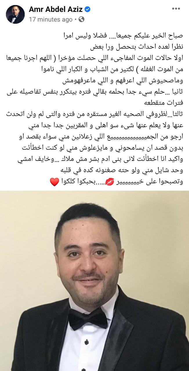 وكتب عمرو عبد العزيز عبر حسابه الشخصي بموقع التواصل الاجتماعي “فيسبوك”: “صباح الخير عليكم جميعا.. فضلًا وليس أمرًا، نظرًا لعدة أحداث تحدث وراء بعض، أولًا حالات الموت المفاجئ التي حصلت مؤخرا (اللهم أجرنا جميعا من الموت الغفلة) لكثير من الشباب والكبار اللي ناموا ومصحيوش اللي أعرفهم واللي ماعرفهمش”.