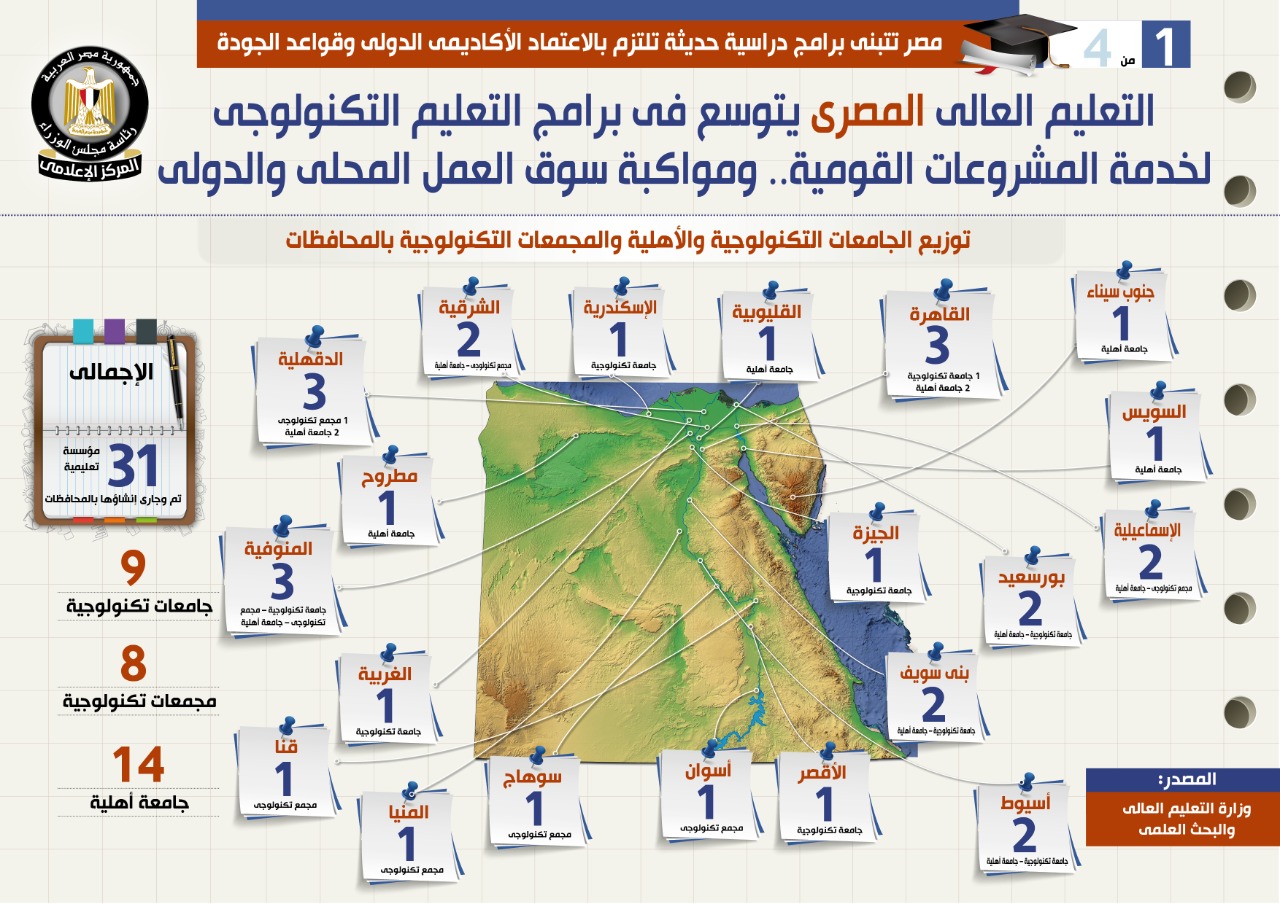 نشر المركز الإعلامي لمجلس الوزراء تقريرًا تضمن إنفوجرافات تسلط الضوء على توسع التعليم العالي المصري في برامج التعليم التكنولوجي لخدمة المشروعات القومية، ومواكبة سوق العمل المحلي والدولي، وذلك من خلال تبني برامج دراسية حديثة تلتزم بالاعتماد الأكاديمي الدولي وقواعد الجودة.