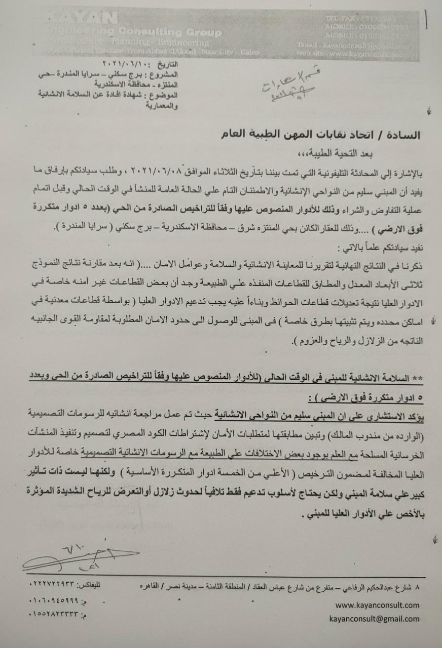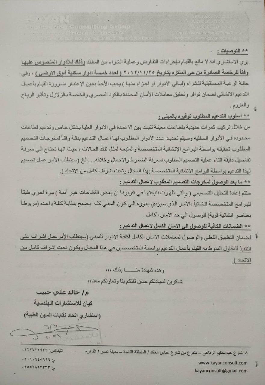 4- العمارة غير آمنة وبها العديد من العيوب الإنشائية، طبقا لتقريري الاستشاري الهندسي للاتحاد.