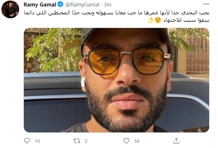 وكتب رامي جمال تغريدة، بحسابه الشخصي عبر موقع تويتر قائلًا: “بحب التحدي جدًا لأنها عمرها ما جت معايا بسهولة، وبحب جدًا المحبطين اللي دائما بيبقوا سبب للاجتهاد”.